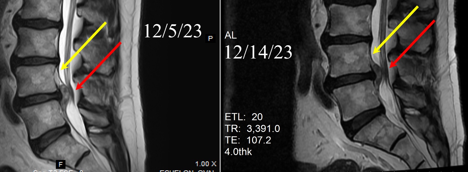 Based on evidence, large disk herniations start to regress by a few millimeters (mm) within 10 days of receiving our proprietary treatments. In this example below, a large disc herniation was found to be compressing on the lower part of the spinal cord called cauda equina causing severe pain symptoms in the patient (Left Image, red arrow). Within 7 days of a SINGLE treatment (treatment date 12/7), the large disc herniation had regressed releasing the free floating fibers of the cauda equina (Right Image, red arrow). The patient not only got immediate pain relief but also effectively avoided surgical treatments, such as open laminectomy and the adverse events that may follow such surgical treatments. Additionally, multiple treatments and repeat injections are NOT required for this specific disc herniation, as the herniation will continue to regress without repeat treatments